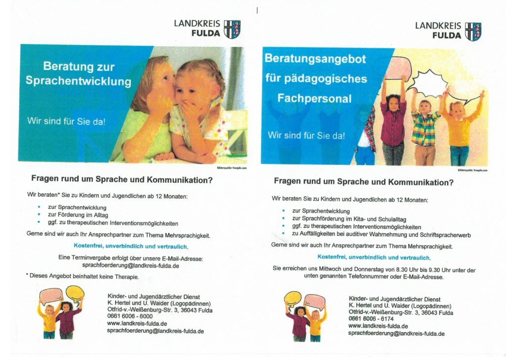 Haben Sie Fragen rund um die Sprachentwicklung Ihres Kindes vor dem Schuleintritt? Dem Flyer können Sie nähere Informationen zu dem Beratungsangebot des Landkreises Fulda entnehmen.
